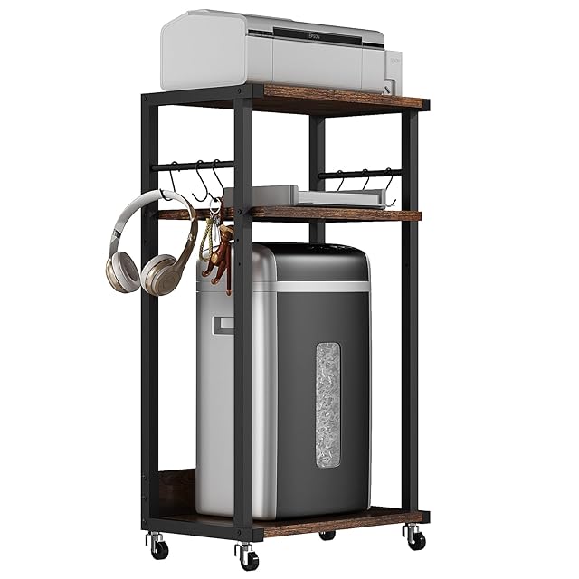 YMYNYモバイルプリンタスタンド 3段プリンタテーブル 木製ラック付きカート 落下防止パネル 高さ調整可能 プリンタキャビネット 360°回転キャスターと調整可能な足付き収納棚は ホームオフィス オフィス リビング ベランダに適している 茶色 JPHPT002H | primer