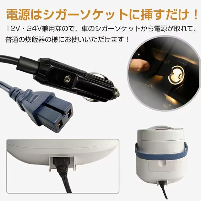 【車中泊やキャンプの強い味方】車載用炊飯器は、アウトドアや車中泊、キャンプなど様々な場面での活躍が間違いなし。食事の心配なく快適な時間を過ごせます!【手軽なシガーソケット給電】車載用炊飯器は12V・24V兼用で、シガーソケットに挿すだけで使えるので、外部電源の心配なく簡単にご飯が炊けます!【コンパクトで場所を取らない】全長23cm×21.5cm×奥行き23.5cmのコンパクトサイズ。ガレージや車内での収納もラクラクで、場所を取らないデザインです!