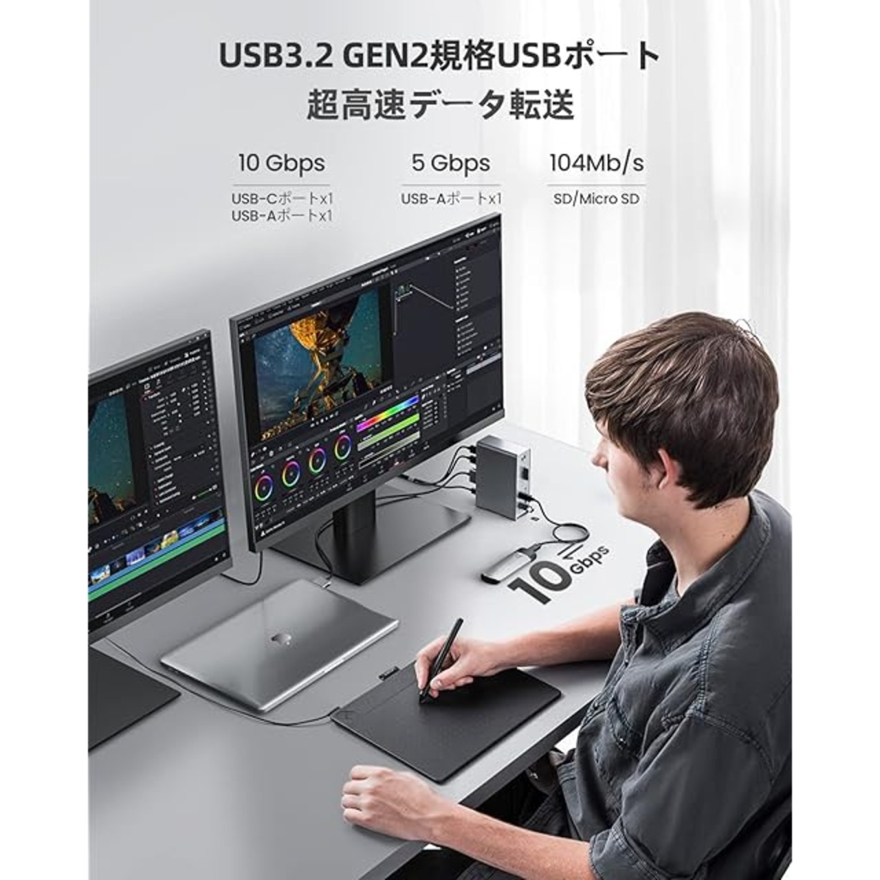 【超高速データ転送 - 10Gbps】USB3.2 Gen2対応のUSB-C、USB-Aポートが一つづつ搭載され、最大10Gbpsのデータ転送速度をサポートしており、仕事をぐんと効率化!また、USB-A 3.0が3つ、USB-A 2.0も2つあり、OTG機能、キーボード、マウス等の設備を増設したいなら欠かせないものとも言えます。なお、3.0規格のSD/TFカードスロットも一つずつ搭載され、読込スピードが104MB/Sに達し、最大2TBのSD/TFカードに対応しております。