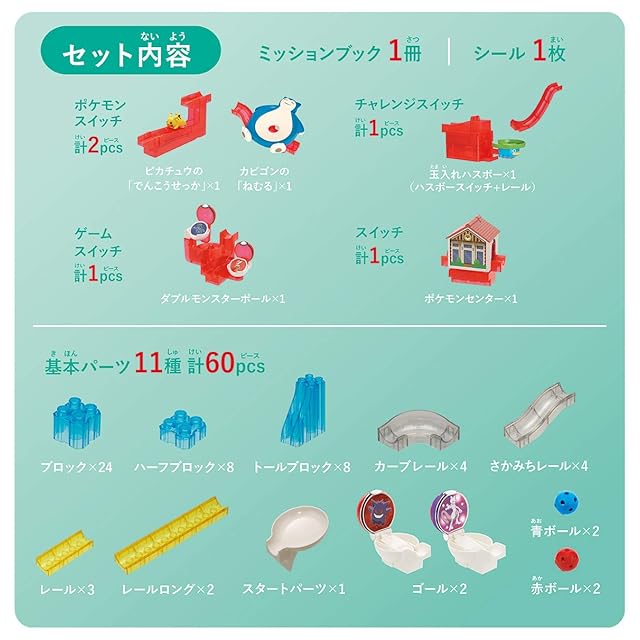 【セット内容】●ミッションブック1冊●シール1枚●ポケモンスイッチ2種(ピカチュウの「でんこうせっか」×1、カビゴンの「ねむる」×1)、●チャレンジスイッチ(玉入れハスボー×1)●ゲームスイッチ(Wモンスターボール×1)●スイッチ(ポケモンセンター×1)●基本パーツ11種計60pcs(ブロック×24、ハーブブロック×8、トールブロック×8、カーブレール×4、さかみちレール×4、レール×3、レールロ