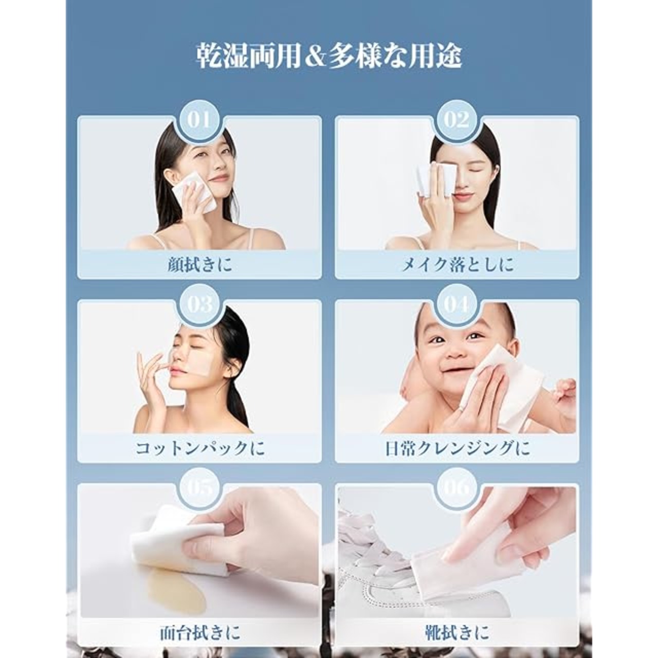 【多様な用途・コスト最高】 顔のふき取りのほか、メイク落とし、全身清拭、手拭き、日常の食べこぼしや、掃除など幅広い用途で使用可能。