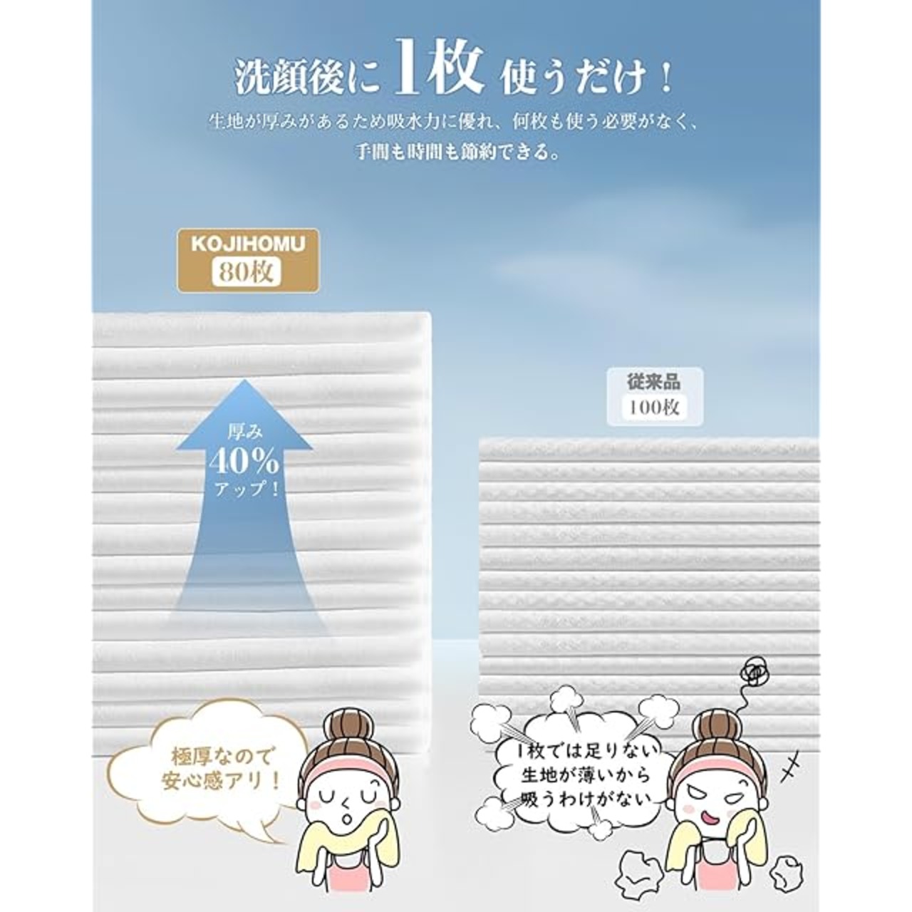 【100% コットン】KOJIHOMU クレンジングタオル 極厚 使い捨てタオル フェイシャルタオル 敏感肌 乾湿両用 洗顔 化粧 メイク落とし 肌荒れ対策 洗顔タオル 80枚×3パック 20x20cm