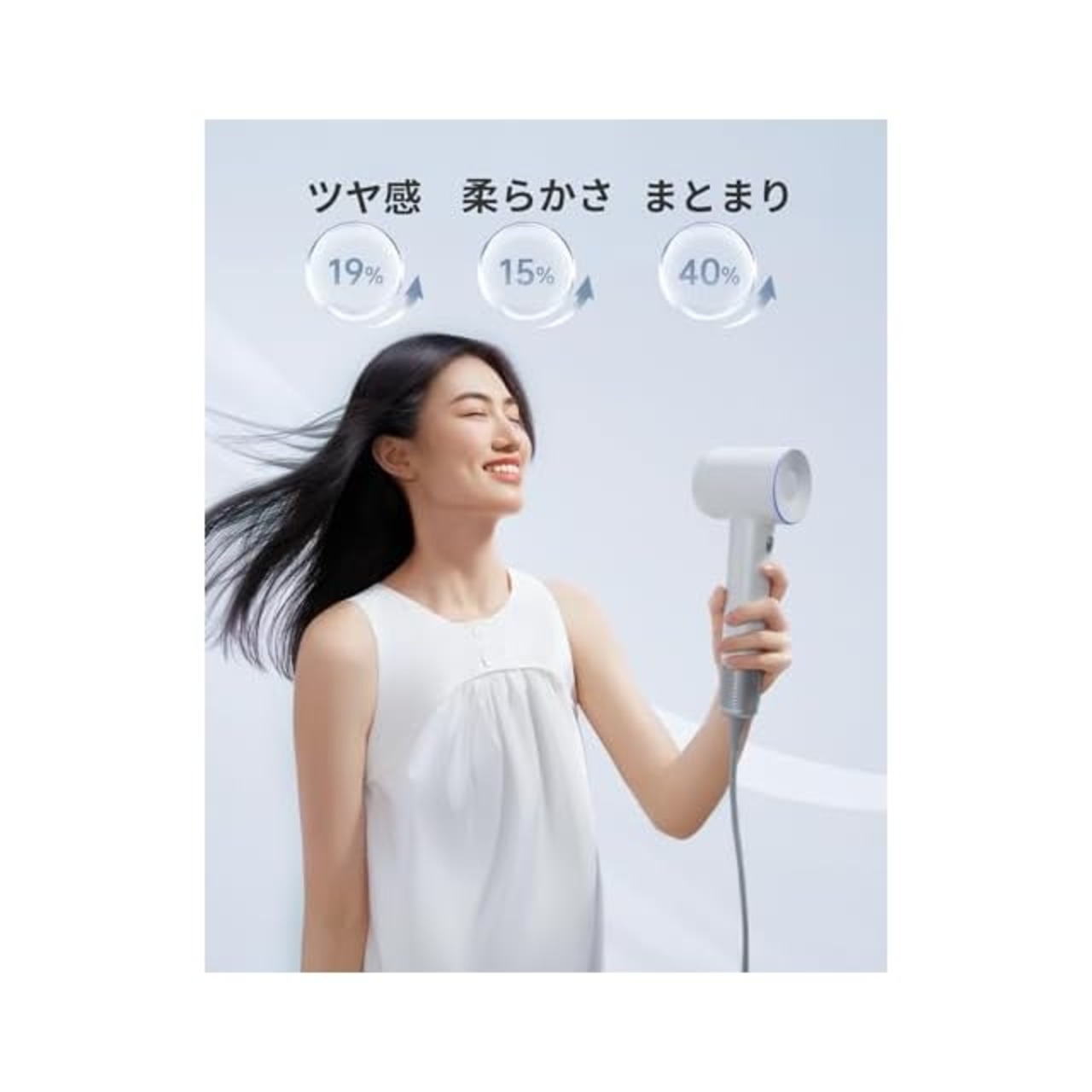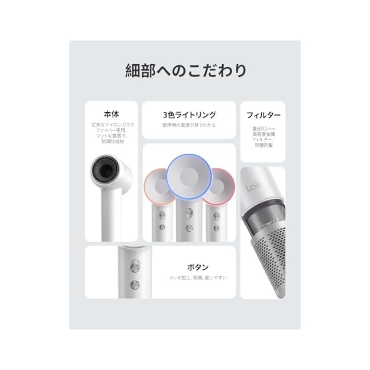 【3色LEDライトリング&低騒音体験】LEDライトリングの3つの色は、異なる温度設定に対応しています:赤色80℃(熱風)/ 黄色50℃(温風)/ 青色(冷風)。ライトリングを2秒間長押しすると、冷熱風交互モードが開始され、髪をダメージから守ります。強力なモーターと風量でありながら、Laifen SWIFT ヘアドライヤーの動作時の騒音はわずか59dB。静かな音でヘアドライの時間をストレスなく楽しむことができます。