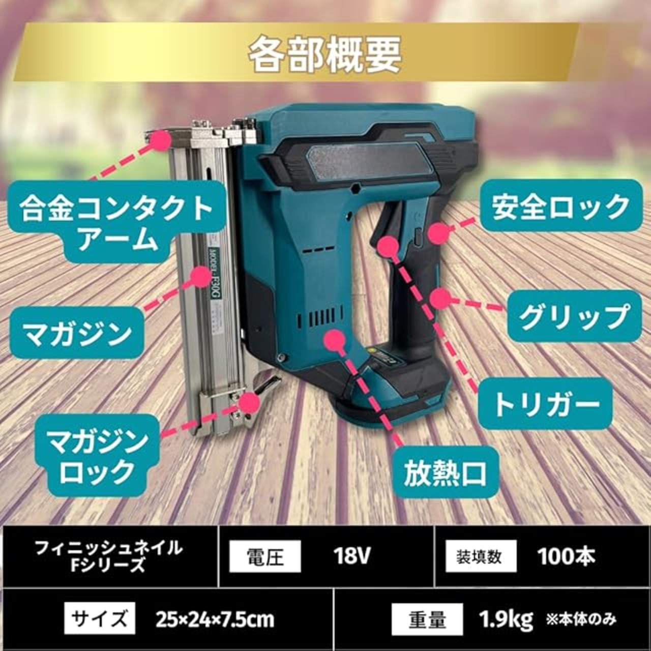 安心のブランド「 Longsafe 」 ※こちらはフィニッシュネイル専用となります。ステープル、ピンネイルは使用できません。<br> <br> 充電式なので取り回しが良く、場所を選ばずスムーズな作業が可能になります。<br> 家庭でのDIYはもちろん、プロの方にもおすすめです。<br> <br> ◆単発モードと連続モードの切り替え可能<br> 素早く打ち込みたいときには連続モード、精密な作業が必要な場合には単発モードをお選びいただけます。<br> <br> ◆仕様<br> ・サイズ:25×24×7.5cm<br> ・重量:1.9kg(本体のみ)<br> ・対応ピン:30mm<br> <br> ◆内容物<br> ・本体×1<br> ・<br> ・日本語取扱説明書<br> ※バッテリー、充電器は別売り<br> <br> ◆互換性商品ですが以下のマキタ純正バッテリーに対応しております。<br> [18V]<br> BL1820 BL1820B<br> BL1830 BL1830B<br> BL1840 BL1840B<br> BL1850 BL1850B<br> BL1860 BL1860B<br> BL1890 BL1890B<br> ※14.4V / ライトバッテリー非対応<br> ※商品のデザイン、色等は予告なく変更となる場合がございます<br>