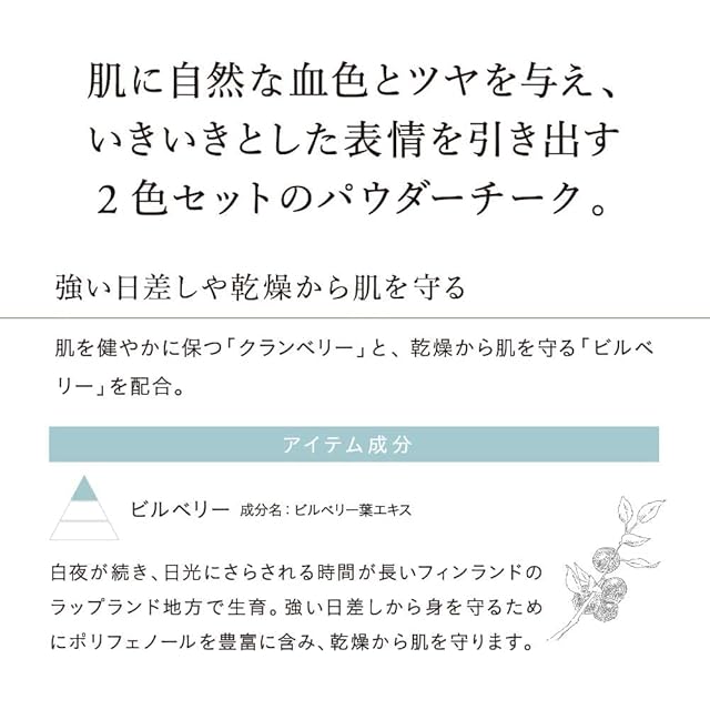 全成分:成分:タルク、シリカ、スクワラン、ジステアリン酸Al、ステアリン酸水添ヒマシ油、オリーブ果実油*1、ホホバ種子油*1、ヒポファエラムノイデス果実油*1、クランベリー種子油*1、ビルベリー葉エキス*2、カルナウバロウ、(+/-)酸化チタン、酸化鉄、グンジョウ、マイカ、カルミン、水酸化Al *1オーガニック成分 *2ワイルドクラフト成分