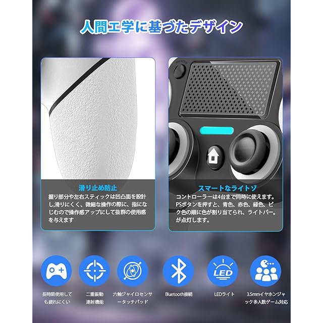【PS4コントローラー 2025年日本限定】新しい世代の PS4ワイヤレスコントローラーはP3/P4/P4 Pro/P4 Slim/Android/PC(Windows7/8/10)スマートフォンなど にも対応できます。最新のP4システムも対応します。最新のチップデザインが搭載され、モーションセンサー、振動、タッチパッドなど 最新機能に加えて、独自の連射機能も備えており、ps4コントローラー純正よりも優れています。最新のBluetooth接続を採用し、高度な機能性と快適性を実現しています、操作フィードバックが速く、動作遅延なし、自由的に操作することができます。さらに、ps4 コントローラーは軽量で耐久性があり、握りやすい手触りを実現しています。人間工学に基づいたデザインにより、長時間のゲーム体験でも疲れることはありません。(注:ps5で使用できませんでした。接続できない場合は、デバイスが上限に接続されているかどうかを確認してください。その他の問題については、背面のピンホールリセットボタンを試してください:2mmの穴(リセットボタン)。