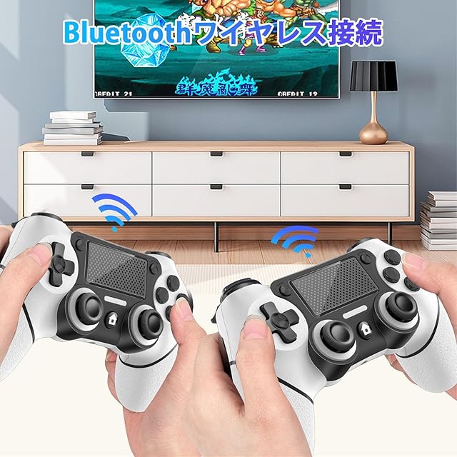 【安定的なBluetooth機能】内蔵の最先端ワイヤレスチップによって、データ転送速度は2.1Mbpsに達しました。対戦相手より0.01秒だけ速いなら、勝利の天秤があなたに傾きます。 P4やパソコンとの通信距離は最大10mとなっており。無線コントローラーなので、1000mAh大容量の充電式バッテリーが搭載されており、有線繋ぐの限制から解放します、自由的に操作することができます。USBインターフェースの高速充電。3~4時間あればフル充電します、16-18時間以上連続でゲームすることができます。USBケーブルが不要なので操作の自由度が高く、遅延がなく、ゲームをスッキリプレイできます。本製品は安定したBluetooth無線接続を採用し、4つのコントローラーの同時接続をサポートします。週末のチームビルディングであろうと家族の夕食であろうと、友人や家族と緊密に交流することができます。ご注意:初めてペアリングする際はUSBケーブルをご使用ください。