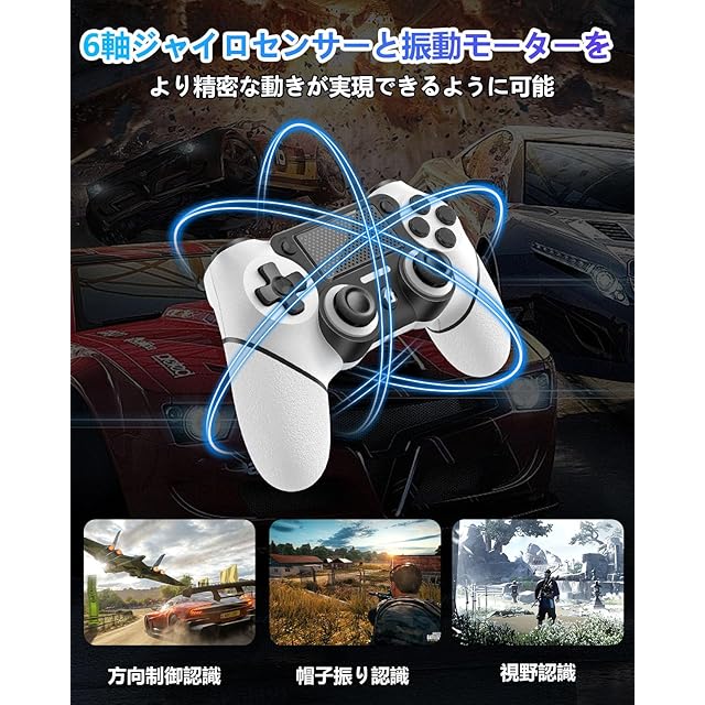 【純正品より多機能】背面ボタン搭載、連射機能、マクロプログラミング機能、6芯重力振動センサー、3.5mmヘッドフォンジャック、新しいTURBO連射、スピーカー、タッチパッド、LEDライト、低電圧警告機能様々な機能がサポート。ラピッドファイア機能,も搭載されており、射撃速度を5回 / 秒、12回 / 秒、20回 / 秒の3つの段階で調整することができます。これにより、アクションゲームのプレイ性を高めたり、FPSで連射を行う際に、より多くの火力で敵を倒すことができます。6軸ジャイロセンサーと高解像度バイブレーションモーターが組み込まれているため、レースゲームではコントローラーの傾きを感知し、傾きセンサーで操作することで、スムーズなドリフトを実現し、直感的な運動制御を楽しめます。PS4のコントローラーは、振動フィードバックや様々な変化により正確な操作感と、よりリアルなゲーム体験を提供します。ご注意:PCおよびiPhoneのすべてのゲームと互換性があるわけではありません。