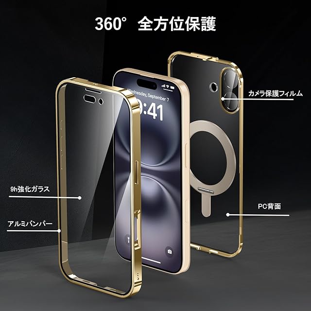 iPhone 16 用 両面 MagSafe対応 ケース アイフォン16 アルミバンパー 360°回転スタンド Uovon スマホケース アイホン16 全面保護 カバー カメラレンズ保護 ワイヤレス充電対応 ロック機能 ・ ゴールド | primer