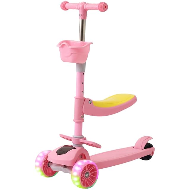 <b>【3輪車にもなる!2way仕様のキックスケーター】</b><br> シートが付いているので、立ち乗りに疲れたら3輪車としても遊べます。<br> シートの後ろ側を持ち上げるだけで折りたため収納できます。<br> <br> <b>【高さ調節3段階!お子様の成長に合わせて調節可能】</b><br> 工具不要で簡単に調節できます。<br> (1)高さ:約78cm(8~10歳)<br> (2)高さ:約74cm(5~7歳)<br> (3)高さ:約70cm(3~4歳)<br> ■対象年齢3歳~10歳まで 幅広く遊んでいただけます。<br> <br> <b>【光るLEDホイール】</b><br> ホイールが回転することで自動的にきらきら光るので、夕方でも子供の走行が目立って安心です。<br> バッテリーは必要ありません。<br> <br> <b>【安定感抜群の乗り心地】</b><br> タイヤは4.5cmの幅広設計。<br> 前2輪タイプだから安定感抜群です。<br> <br> <b>【体重移動で方向転換】</b><br> 体重をかけた方向に進むので、バランス感覚を身に付けられます。<br> <br> <b>【フットブレーキ】</b><br> 車輪の素材は耐摩耗性と耐荷重性に優れる高反発PUを採用しています。<br> 走行中の音は小さく、振動感も少なく滑らかな走りです。<br> <br> <b>【うれしい 便利な機能 】</b><br> ・折りたたみ式<br> ・すべり止め付きの足置き<br> ・前カゴ付き<br> ・デコレーション<br> <br> <br> <b>【商品詳細】</b><br> カラー:ブルー/ピンク<br> 耐荷重(約):本体/100kg、椅子/30kg<br> サイズ(約):<br> 使用時/W26×D58×H70~78cm<br> 折りたたみ時/W26×D73×H26cm<br> 重量:(約)2.2kg<br> <br> ※簡易組立式<br> ※専用工具付属