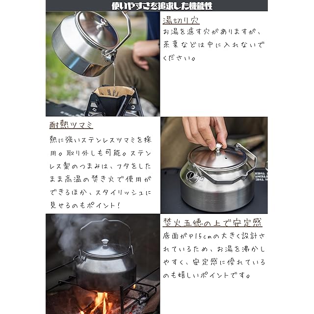 特徴:高品質な18-8ステンレス製で、何年も使い続けることができるように作られています。さび止め加工を施された輝かしい仕上がりや、スチールだけがもたらすことのできる耐久力を兼ね備えており、炭や薪での調理に最適の素材です。蓋が大きく中に収納しやすい。OD缶であれば、110缶なら余裕で入ります。230g缶も入れます。