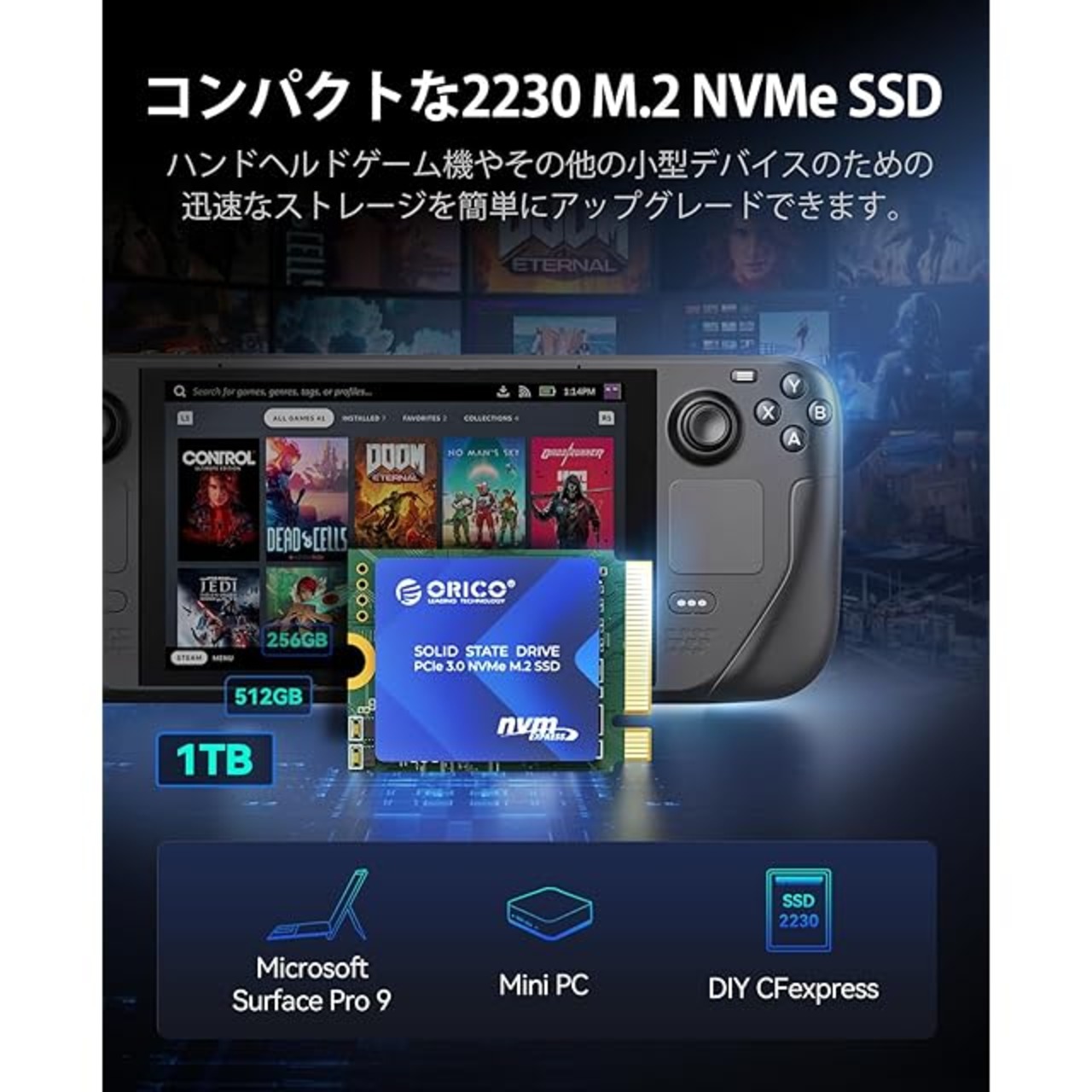 【Steam Deckなどとの互換性】: 空間が限られたデバイス向けに設計されたORICO J10-2230 SSDは、ハンドヘルドコンソール、超薄型ノートパソコン、ミニPC、DIY CFexpressカードに最適なストレージ拡張ソリューションです。このコンパクトなNVMe M.2 2230 SSDで、デバイスを手軽にアップグレードしましょう。