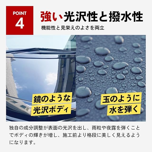 【①施工しやすい】ムラになりずらい溶剤で失敗が少ない。粘性の高い溶剤を使用すると持続性が高い反面ムラになりやすいと言われていたが、適切な容量を配分することで施工のしやすさと高い持続性の両方を実現しました。【②雨染みに強い】短い硬化時間と、有機と無機のハイブリッド【③長い耐久年数】施工が長持ちするので手間がかからない。塗ってから約3年輝きが続く。【④強い光沢性と撥水性】機能性と見栄えのよさを両立。鏡のような光沢ボディ。玉のように水を弾く。