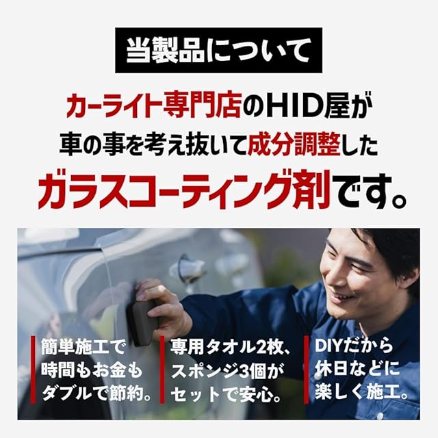【輝きが戻ってくる】愛車を雨から守る、キズを防ぐ。【当製品について】カーライト専門店のHID屋が車の事を考え抜いて成分調整したガラスコーティング剤です。簡単施工で時間もお金もダブル節約。専用タオル2枚、スポンジ3個がセットで安心。DIYだから休日などに楽しく施工。