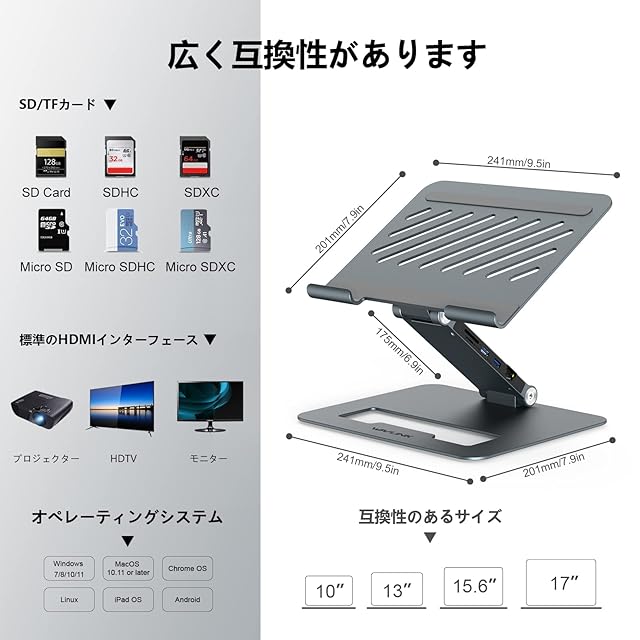 WAVLINK アルミ制の調整可能なノートpc用スタンド 9-in-1 USB-Cドッキングステーション付き 人間工学に基づいたポータブルpc昇降折りたたみマウント MacBookおよびWindows互換 10~17インチノートpcおよびタブレット | primer