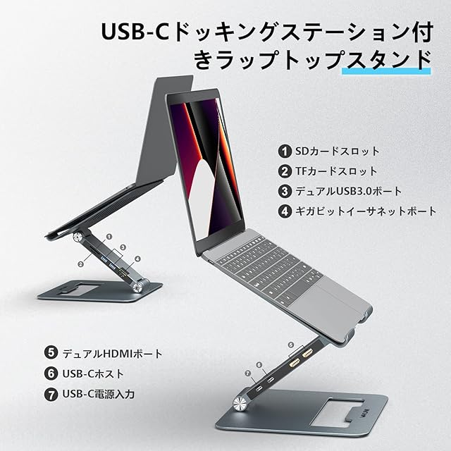 【特徴】:USB-Cドッキングステーション付きノートpcマウントノート型スタンドでありドッキングステーションでもあります.。 type-cケーブルでホストPCから接続するUSB 3.0ポートは、デュアルHDMIビデオ出力、有線ギガビットイーサネット、85W PD充電ポート、電源入力ポート、SD/TFカードスロットと2つのUSB 3.0ポートを拡張できる。人間工学に基づいたノートpc用ステント。首と肩の痛みを軽減し、作業効率を向上させます。