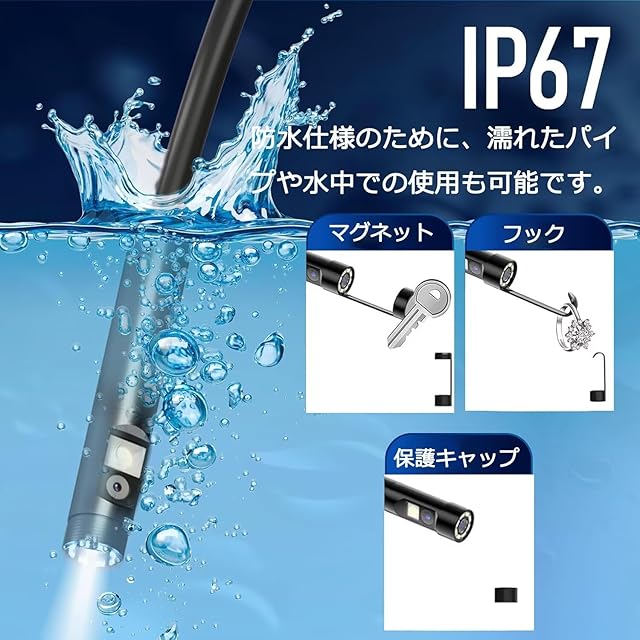 【IP67防水&高輝度・無段階調光】カメラ部分に8つのLEDライト、側面に1つのLEDライトを搭載しています。さらに無段階調光可能な高輝度LED搭載で暗い場所でも鮮明な映像を映します。ケーブルとスコープはIP67レベルの防水仕様のために、濡れたパイプや水中での使用も可能です。