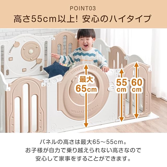 【スタッフのおすすめポイント!】<br> <br> ・2色使いがおしゃれなベビーサークル<br> ・必要な時だけサッと取り出せる 折りたたみ式<br> ・ドアは可愛いくまさんデザイン<br> ・楽しく遊べるおもちゃパネル<br> ・工具不要で設置簡単!ジョイント式<br> ・お部屋に合わせた形にレイアウトOK<br> ・ズレを防止する滑り止め付<br> ・安心のロック付きドア<br> ・やさしい丸角設計<br> ・届いてすぐに使える完成品<br>