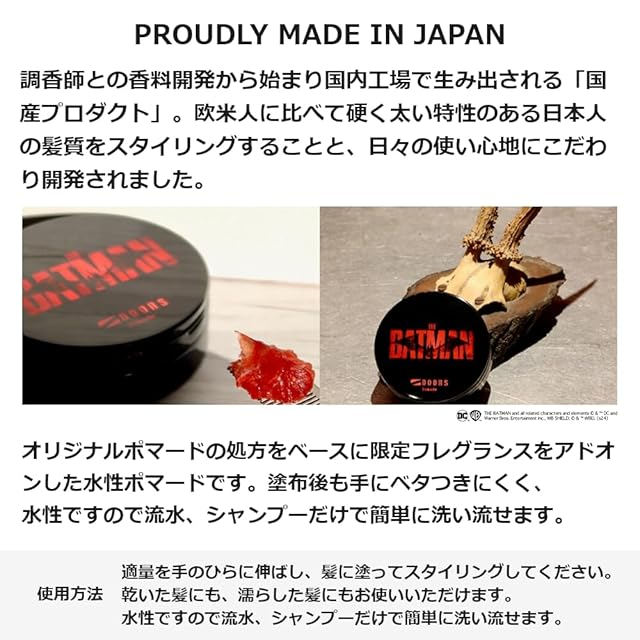 DOORS meets HOLLYWOOD<br>ゴッサム・シティの闇夜に差し込む一筋の光、希望、HERO。「BATMANポマード」を限定生産。<br><br>限定フレグランス「HOPE」<br>ビターでほろ苦さも感じられるネロリの花の香り。そのフローラルから生み出される爽やかな柑橘系フレグランスが世界中で愛されるネロリ。ビタースイートな「大人の柑橘系 HOPE」をご体感ください。<br><br>BATMAN POMADE<br>オリジナルポマードの処方をベースに限定フレグランスをアドオンした水性ポマードです。塗布後も手にベタつきにくく、水性ですので流水、シャンプーだけで簡単に洗い流せます。<br><br>PROUDLY MADE IN JAPAN<br>調香師との香料開発から始まり国内工場で生み出される「国産プロダクト」。欧米人に比べて硬く太い特性のある日本人の髪質をスタイリングすることと、日々の使い心地にこだわり開発されました。<br><br>HOPE IN THE CITY<br>デカダンな世界、街、人々に囲まれたとしても、その闇夜を切り裂く一筋の「希望 HOPE」をひとりひとりの胸に持ち続けてほしい、という願いをこのプロダクトに込めました。ひとりひとりの希望、ライフスタイルにあわせた大人のスタイリングをお届けします。<br><br>限定フレグランス「HOPE」<br>ビター(闇夜)な香りから際立つネロリの柑橘系フレグランス(光)。世界中で愛されるビタースイートな「大人の柑橘系」です。トップノートに柑橘系のベルガモット、レモン、ライム、ミドルノートでフラワリーなネロリ、ジャスミン、ラベンダー等で主調し、ラストノートはムスク系で調和させたオリジナル香料です。