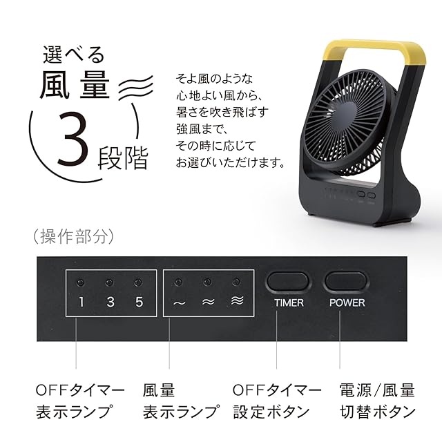 【風量3段階調節】弱・中・強の3段階で設定可能で、お好みに合わせて調節できます。又、羽根径12㎝・羽根枚数4枚で力強い風量を実現しておりますので、満足度の高い清涼感です。