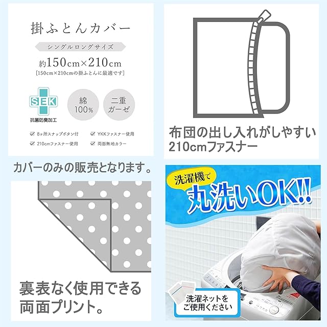 製品サイズ:約150×210cm(シングルロングサイズの掛布団用に対応しています。)