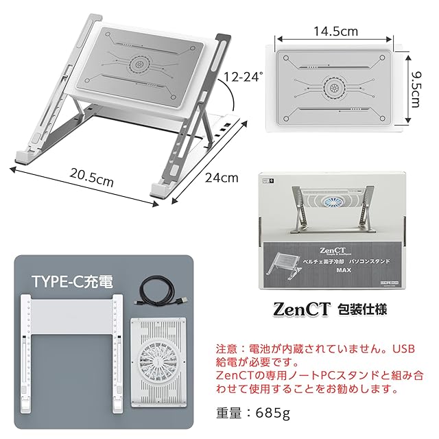 ZenCT ノートパソコン クーラー ノートPCスタンド ペルチェ素子 冷却パッド 冷却台 折りたたみ式 5段階高度調整可 ノートPC 冷却 クーラー 電子の力で瞬間冷却 低騒音 強冷冷却ファン アルミ合金製 LEDバッグライト付き 7-16インチまでのノートPC/Macbook/Macbook Pro/PS3/PS4/Switch等に対応 オフィス/在宅勤務/出張などに適用 日本語取扱書付 大きい冷却クーラー CT158MAX