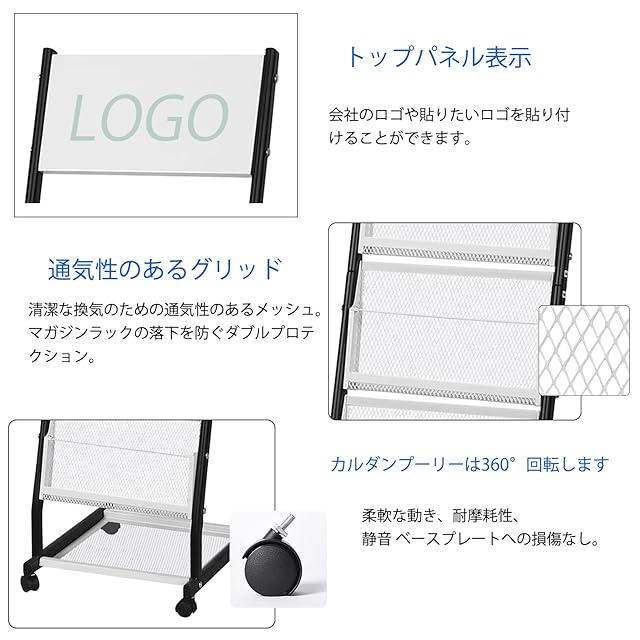 【多機能】マガジンラックは4輪で移動に便利です。レセプションエリア、待合室、学校、図書館、観光案内所、観光名所、ショールーム、ヘルスセンターでの使用に最適。あらゆる種類の情報、パンフレット、リーフレット、雑誌を表示します。
