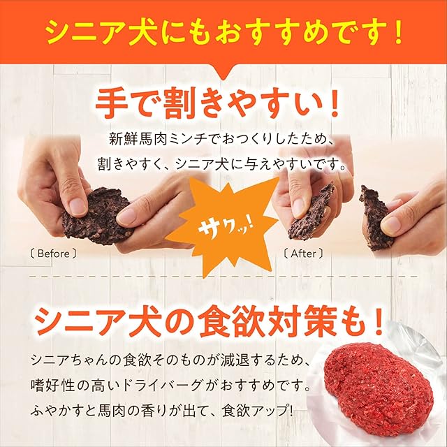 #5 \一口に割けやすく、与えやすい!/ つなぎ不使用、新鮮馬肉ミンチ100%のため、手でも簡単にさっくりと一口サイズに割くことができます。口の力が弱いシニアや小型のワンちゃんにおすすめです。