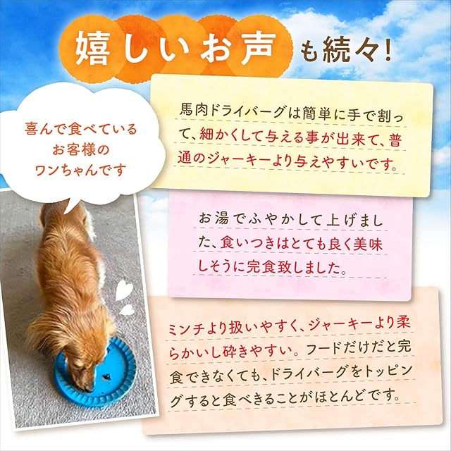 #4 \体にやさしい馬肉!/ 一般のおやつに使用されている豚肉や牛肉などと比べて、馬肉は低脂質、高タンパク!たっぷりの鉄分、たんぱく質とEPAなどの栄養素で体をサポート!しかも!馬肉は低アレルゲン食材と言われているため、アレルギーをお持ちのワンちゃんも是非お試しください!