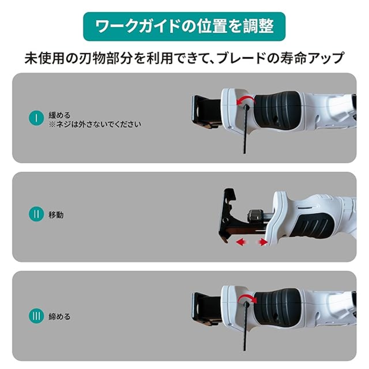 木材・枝の切断に 塩ビ・プラスチック・竹の切断に 一般金属の切断に 片手で持てて、コ-ドレスで便利な充電式,場所を選ばず作業できます。 ハイパワーで高速切断,優れた切断能力で作業がはかどります。 木工用ブレード・鉄鋼用ブレード・プラスチック用ブレードの3種類の刃で様々な用途に対応。 ●3種類の刃で様々な用途に対応 木工用ブレード用途:木材、枝の切断 鉄工用ブレード用途:斬鉄、非鉄(アルミ・銅) 塩ビ・PC用ブレード用途:塩ビ・プラスチックの切断 ●ブレードの交換は工具不要 ブレードの着脱も簡単,リングを緩めるだけで着脱できる。●ガイドプレートも調整可能 本体下部の固定ねじを緩めるとプレートの位置を調整可能。●充電残量表示機能付 充電残量チェッカーボタンを押すと残量に応じて3段階でランプが点灯。 ●軽量&無段変速 軽量で長時間の使用でも疲れにくく、持ち運びもしやすい。 ●セット内容 【レシプロソー本体×1】 【バッテリーパック×1】 【充電アダプター×1】 【木工用ブレードx2】【鉄工用ブレードx1】【塩ビ・PC用ブレードx1】【六角棒レンチ×1】