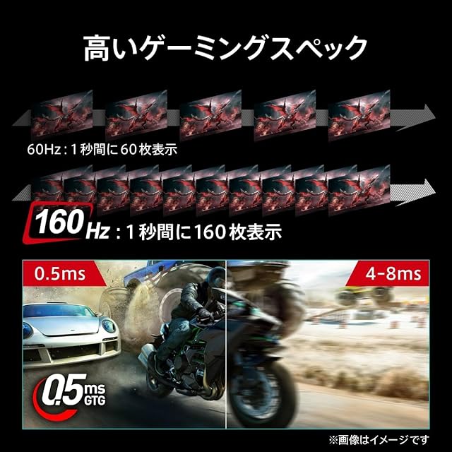 ●最大リフレッシュレート:160Hz●応答速度:0.5ms(GTG、最小値)●パネル駆動方式:RAPID IPS●表面タイプ:ノングレア