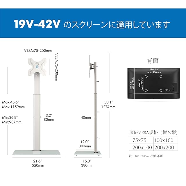 ⛄【VESA規格対応】VESA規格(テレビ背面のネジ穴間の距離)は75x75mmから200x200mmまで対応可能です。(100*200mmは適応できない)当製品が19~42インチのテレビやモニターに適応します。