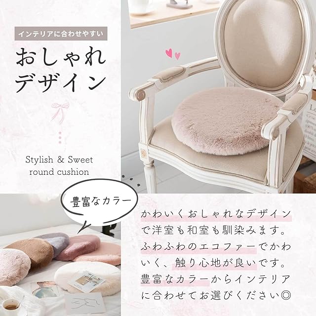 ★サイズ:直径40cm。北欧風のデザインで、色々なインテリアにマッチします。また、フェイクファーを使用しているため、フワフワの手触りです。★低反発:クッションの中身は厚み4cmの高品質な低反発なので、座った際にゆっくり沈む、適度な柔らかさです。長時間座ってもお尻が痛くなりません。★素材:<フェイクファー・クッションカバー>ポリエステル100% <クッション中身>ポリウレタン100%★利用シーン:テーブル、 ローテーブル 、座卓用クッション、ダイニングチェア、オフィスチェア、車中のシートなど様々な場面で活用できます。またデスクワークにもお勧めです。★お手入れ:はじめは少し毛が抜けますが、商品に問題はありません。センタージッパー採用で、中のクッションの出し入れが便利です。カバーは洗濯ネットに入れれば、洗濯可能なので、お手入れも簡単です。※ご注意:お届けの際は、郵送の都合上折りまげておりますが、商品に影響は与えませんので、ご安心ください。