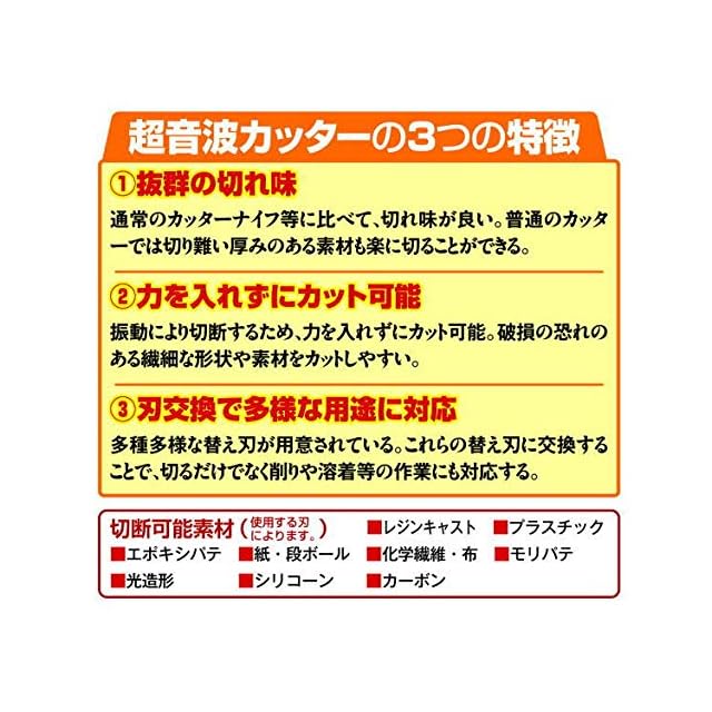 ・プラスチックがサクサク切れるホビー用に開発された超音波小型カッターZO-30プラⅡ ・プラモデル製作などに最適なローコストモデル。薄刃体験セット付き。 ・本体電源をONにして、手元スイッチを押すと動作します。(押している間だけ動作) ・超音波メーカー本多電子株式会社で製造しています。 ・コンパクト設計で持ち運びにも便利です。