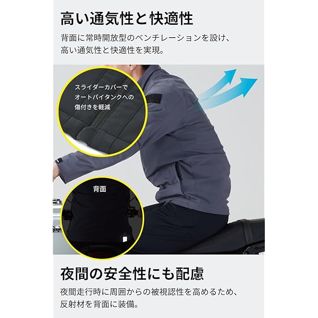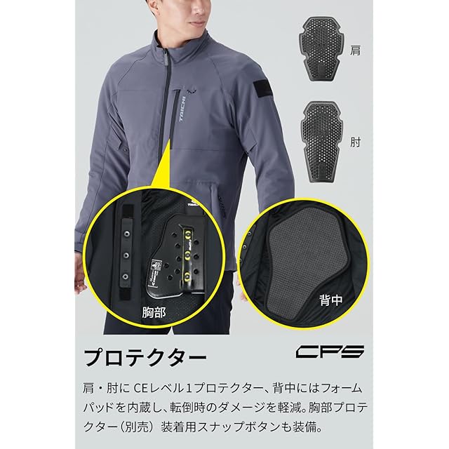車種やスタイルを問わない、シンプルなデザインのジャケット。 表面に撥水加工を施した、高強度エアスルーストレッチ生地を採用し、柔らかい着心地と高い通気性を実現。胸部プロテクター(別売り)を装着するためのアタッチメントを装備。スナップボタンで胸部プロテクターの取付けが可能。(CPS対応)標準装備の肩・肘・背中の各プロテクターはCE Lv.2プロテクター(別売り)でアップグレード可能。※高ストレッチ生地の特性上、生地表面に擦れや引っ搔きなどによる白っぽい線跡が生じることがありますが、洗濯することで緩和されます。