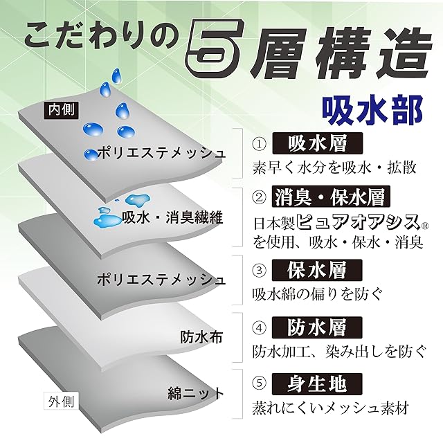 安心な5層構造:吸水拡散→消臭保水→防水→身生地