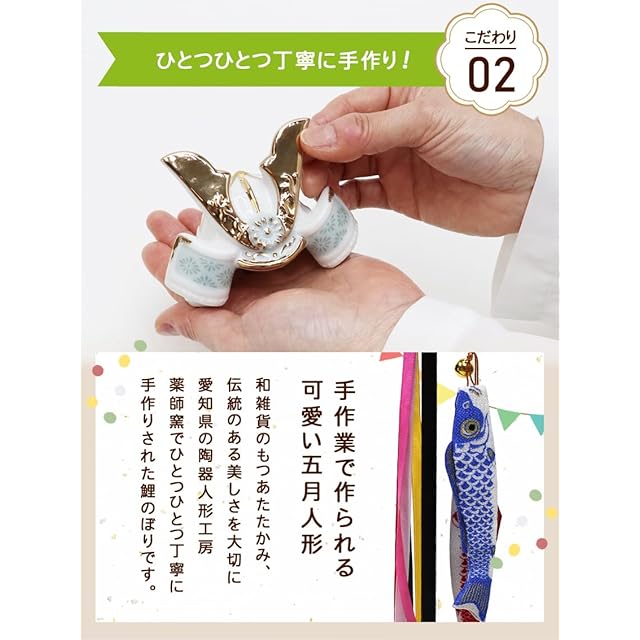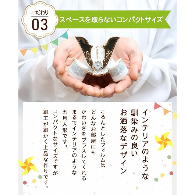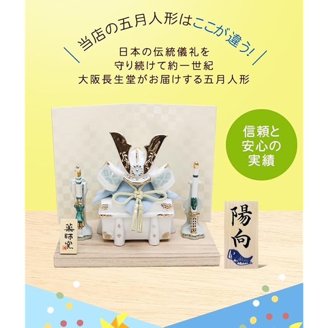大阪長生堂 五月人形 コンパクト ミニ 陶器 名入れ 木札特典付(別送) 兜飾り 染絵出世兜飾り(白藍)