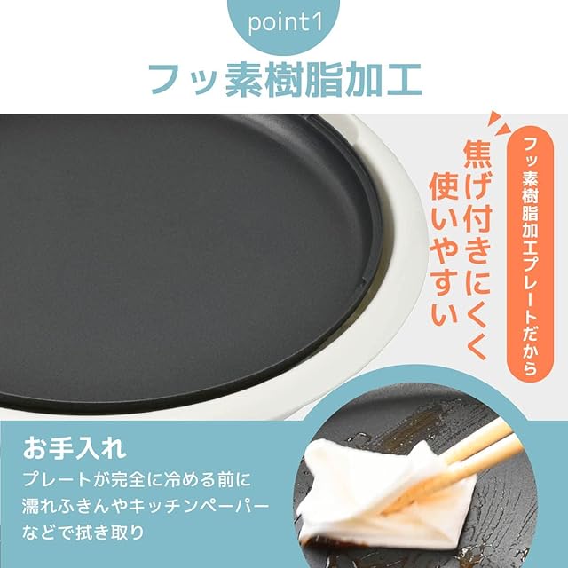 【 特 長 】 ◆1300W/230℃ で高温調理ができます ◆フッ素樹脂コーティングでお手入れしやすい ◆耐熱強化ガラスふた付き ◆コントローラーはダイヤルつまみで温度調節ができます ◆プレート着脱式でお手入れラクラク