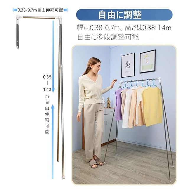 サイズ<br> <br> 収納時:幅9.5×高40×奥行5.5cm<br> <br> 使用時:幅40~90×高38~143×奥行46cm<br> <br> 【折りたたみ式物干し】平日の衣類干すとか、ベランダの小さい家庭には最高のおすすめ。高さは最大135cmまで、長さは32cmから73cmまで自由に調整できますので、都合より利用できます。梅雨時期や花粉にお悩みの方の部屋干し対策にもオススメ。省スペースでもしっかり干せる洗濯物干し。<br> <br> 【高耐久性】この伸縮型物干しは高品質ステンレス鋼で作られており、市販されている他の鋼管の厚さが16 mmの製品とは異なり、本製品は厚さ18mmの鋼管を使用しているため、耐久性があります。<br> <br> 【10秒展開組立なし】組立は工具不要なので、使う時はすぐ使えるんです。使わない時に折り畳み収納可能で、スペースを取らない。収納時の高さは(固定タイプ)約34cm(伸縮タイプ)136cm、スーツケースにも収納できる、出張や旅行用にもぴったり!<br> <br> 【倒れにくい安定設計】バランスよく配置された四本の脚が全体をしっかりと支えるので、どの方向にも倒れにくいです。この4本の足にはシリコンキャップが付いていおり、滑りにくく耐摩耗性に優れている。凸凹した室外や滑らかな床でも安定して立つことができます。<br> <br> 【いろんな場所に大活躍】室内から屋外までさまざまな場所で使用できます。軽量で持ち運び便利なので、キャンプや旅行などの外出時にこのハンガーを持ち運ぶのにも最適です!<br>