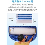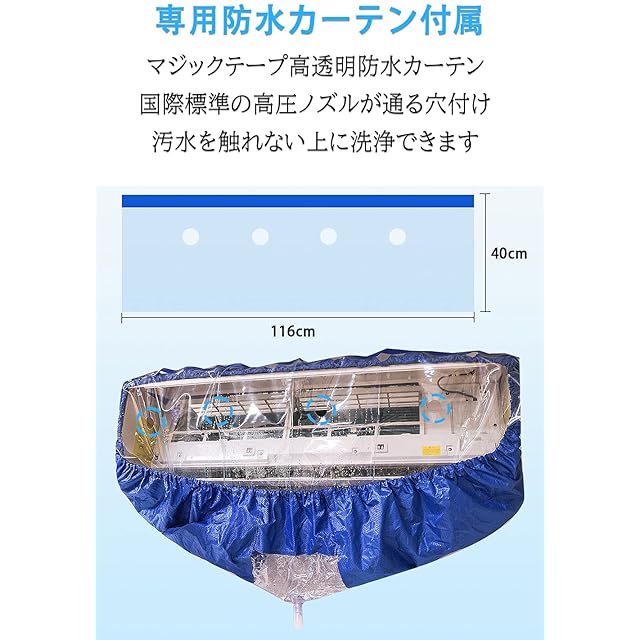 商品仕様<br/> 材質:オックスフォード+PVC(防水) <br/> 重量:Sサイズ-1256g Lサイズ-1390g<br/> 排水口の直径:2cm /排水ホース長さ:280cm<br/> 対応のエアコンサイズ<br/> Sサイズ:長さ70~100cmのエアコン適用<br/> (外周250cmまで、幅90cmまで対応)<br/> <br/> Lサイズ:長さ100~130cmのエアコン適用<br/> (外周350cmまで、幅96cmまで対応)<br/> <br/> パッケージ内容:<br/> クリーニングカバー* 1枚<br/> サポートプレート*2枚<br/> 280cm透明排水ボース*1本<br/> 正面防水カーテン*1枚<br/> 内部防水シート*4錠<br/> 日本語説明書*1本<br/> <br/> ご使用の前に必ずお読みください<br/> ※1:作業前に、必ず部品全部が正しく取り付けられていることを確認して下さい。<br/> ※2:エアコン右側電装部は、水がかからないように、防水シートや養生テープ等で覆いましょう。電装部に水分が残ると、火災発生の原因となりますのでご注意下さい。<br/> ※3:取り付け前に、ちゃんと電気を切れることを確認して下さい。<br/> ※4:作業の前に、必ず汚水を受け取る容器を用意し、排水ホースを容器に入れて下さい。<br/> ※5:洗濯が終わったら、エアコンカバーをきれいに掃除し、自然に乾かしたら、収納して下さい。<br/> ※6:エアコンが自然に乾かしたら、電源を入れて使います。洗濯したらすぐに電気が入れることを遠慮ください。<br/> <br/> 調査によると、エアコンが不定期を洗濯すると、亜健康を招くことができます。汚染がひどいと、多くの病気を引き起こします。もし長期的にステルス性の汚染源を形成したら、呼吸道の疾病を引き起こすことができます。アレルギー性皮膚炎、風邪と発熱などの病気。また、変な臭いがします。冷凍効果も低下になります。<br/> <br/> 2層防水効果<br/> 厚手の2層防水生地、縫い目も防水加工したことで、従来品より、2倍の防水効果が向上し、もっと丈夫で耐久性抜群です。<br/> <br/> より使いやすい<br/> エアコンとサポートプレートがしっかりフィットで、かんたんに固定できます。自動伸縮ゴムなので、直接エアコンにかぶって、ピッタリフィットします。すぐエアコン掃除が始め頂きます。<br/> <br/> 汚水の遮断にもっと効果的<br/> 専用高透明防水カーテン付属し、マジックテープに貼ってるだけ、汚水を遮断できます。なお、内部用の防水シートが壁にしっかり守っているから、安心にご清潔できます。<br/> <br/> 最適な国際標準2cm排水口<br/> 直径2cm最適な排水口で、280cm十分長さの排水ホースを付属し、この高さこそ、収納も大変便利です。<br/> <br/> お財布に優しい<br/> 頑丈な素材で、エアコン洗浄 カバー、防水カーテンと防水シートも繰り返し利用可能なので、とても経済的です。これさえあれば、エアコンを定期的に清潔できます。さあ、掃除を初めましょう~<br/> 安心なアフターサービス このエアコン洗浄カバーはお買い上げの日より、30日以内、製品不具合が発じた場合、不具合の画像を確認後、無料で迅速に同一の新品と交換致します。ご安心にご利用ください。ご連絡の方法:アカウントサービス内の「アカウントサービス」→「注文履歴」→「販売元:HMT 」→「質問する」から、お気軽にお問合せ下さい。なお、弊店には24時間以内に、解決させて頂きます。<br/>