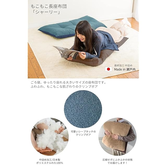 ごろ寝、ゆったり座れる大きいサイズの座布団です。<br> 圧縮せずにふかふかの状態でお届けします。ヘタリが遅く、長くお使いいただけます。<br> 中詰め後の製品サイズ/約57x100x厚み7cm 側サイズ/約60x110cm 重さ/約1kg<br> 中身/ポリエステルわた100%(海外製)中詰め加工/日本製 岡山の自社工場で中詰め製造しています。<br> 生地/ポリエステル100% 裏地/ポリエステル80%綿20% 中国の自社工場で縫製しています。<br> ※ポリエステルわたは消耗品です。お使いになるとヘタりますのでご了承ください。<br>