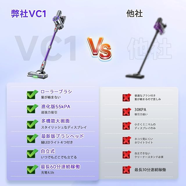 「掃除機を変えるだけで、家中が変わる」 ユーザーの声を反映し、使い勝手を徹底的に改善したこの掃除機。自立式、折りたたみチューブ、絡まないヘッドなど、細部までこだわり抜いた機能で、家中の掃除がもっと簡単で効率的になります。圧倒的な吸引力と快適な使用感を実現した新型掃除機。55KPa超強吸引と大容量バッテリーで、毎日の掃除がストレスフリーに。さらに自立式&壁掛けブラケットで、収納も省スペースでスッキリ!