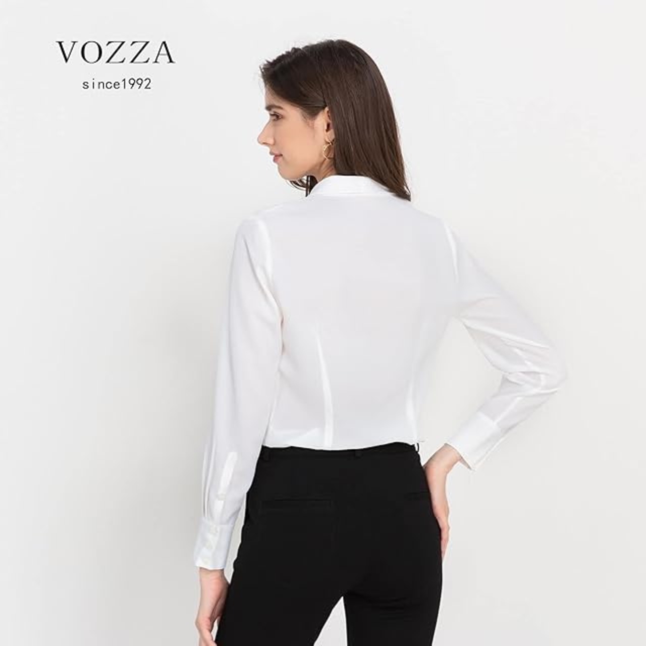 [VOZZA] シャツ ブラウス レディース シフォン リボンタイ 長袖 開襟 ビジネス カジュアル ワイシャツ 女性 無地 ボウタイ ロングスリーブ 通勤 白しゃつ (M, ホワイト)