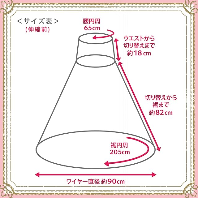 【商品詳細】 フリーサイズ (上部はストレッチのゴムになっております ) ・長さ 100cm(レース82cm、ウエストストレッチ部分 18cm) ・ウエスト周り 65~85cm ※2~3cmの誤差がある場合がございます。