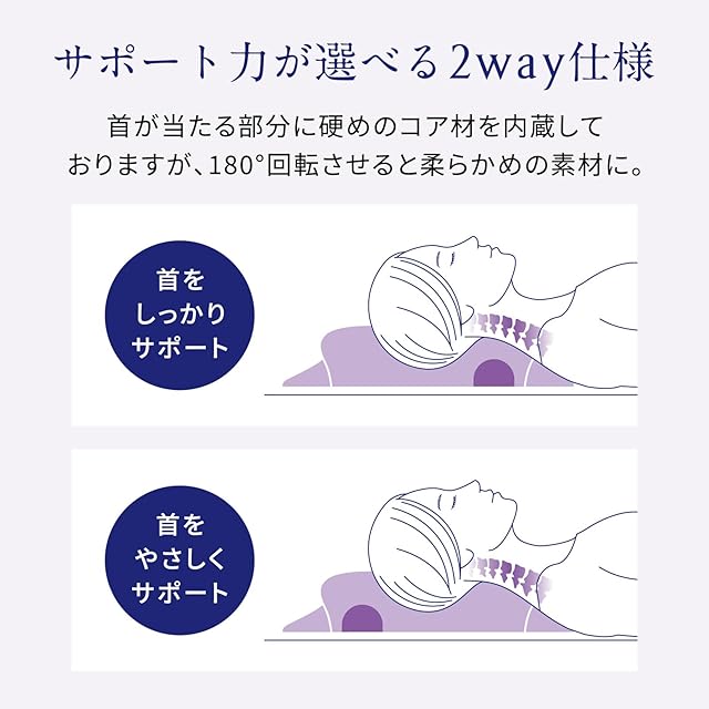 【好みやその日の気分に合わせてサポート力が選べる2way仕様】首が当たる部分に硬めのコア材を内蔵しておりますが、180°回転させると柔らかめの素材に。「昨日は合ってたのに今日はなんか合わないな」という方も、日によって使い分けられます。