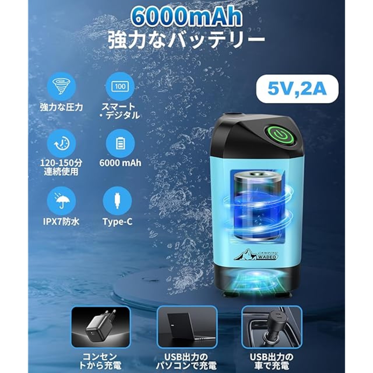 【6000mAh大容量】:電源不要で使えるUSB充電式の ポータブルシャワー です。6000mAhのバッテリーを内蔵し、最大連続使用時間も約150分とたっぷり使えます。一人はもちろん家族や友人と使う場合も使用可能時間が長いので安心です。