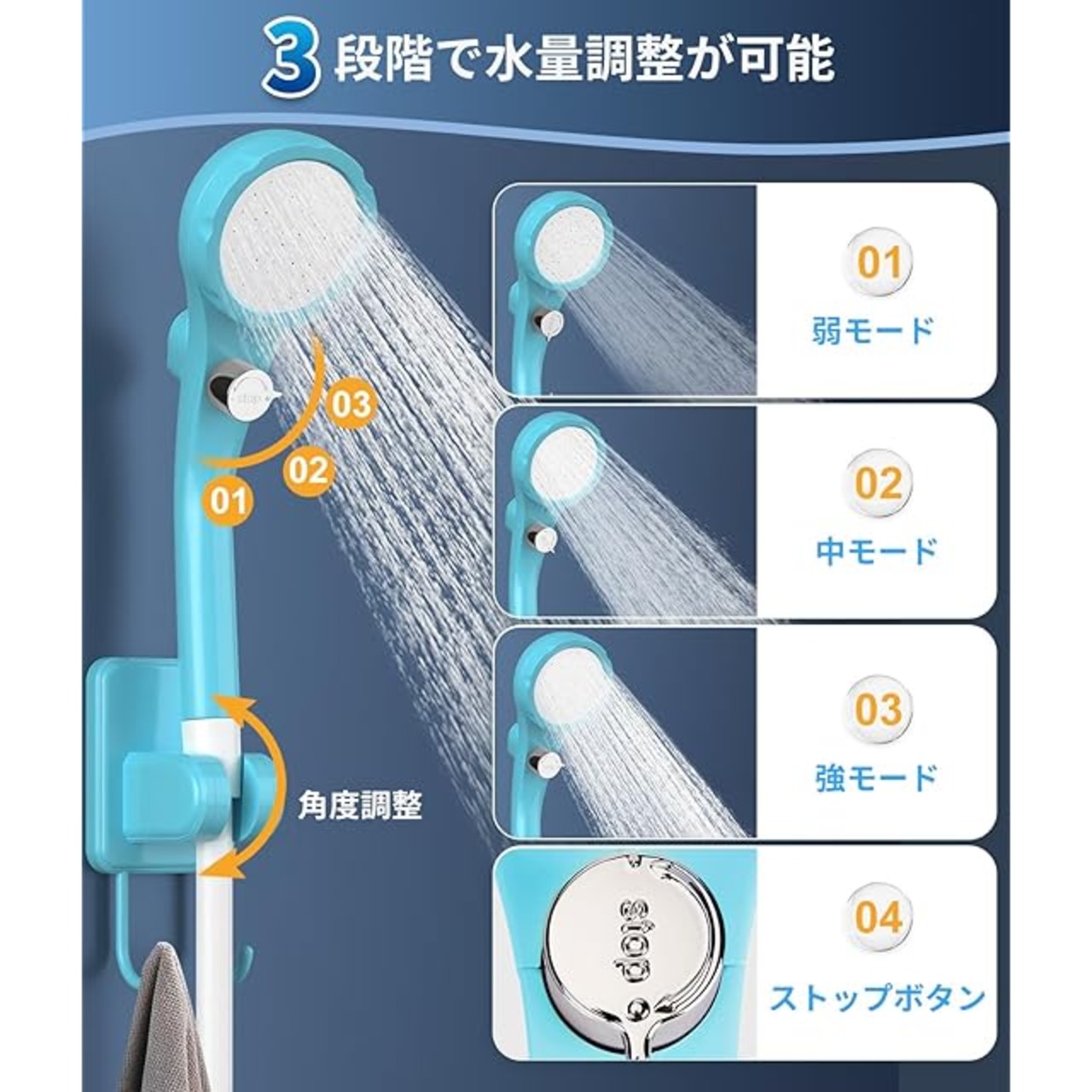 海水浴、川遊び、キャンプやスポーツの後に いつでもどこでも手軽に体を洗えるポータブルシャワー。 レジャーだけでなく災害時にも役立ちます。 USB充電式で最大150分の連続使用が可能なので、大人数でも安心です シャワーヘッドには水量調節ダイヤルと止水ボタン付き。 吸盤シャワーフック付きで、車の窓ガラス等に貼ってシャワーを固定出来ます。 しっかり汚れを落としたいときも、両手が使えます