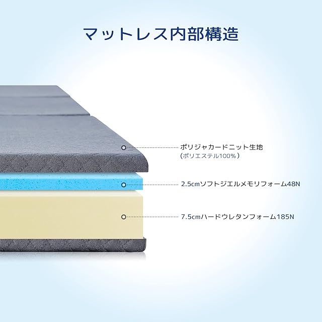 心地よい眠りのための多層構造 - ソフトジエルメモリフォーム(48N) + ハードウレタンフォーム(185N):多層構造のフォームが、体型や姿勢に合わせて身体を優しく包み込みます。マットレス表面のソフトなフォームは穏やかに沈み、体とマットレスの隙間を埋めますが、底面の硬めのフォームが安定した体勢をサポートします。どのような姿勢でも寝心地のよさを感じてください。