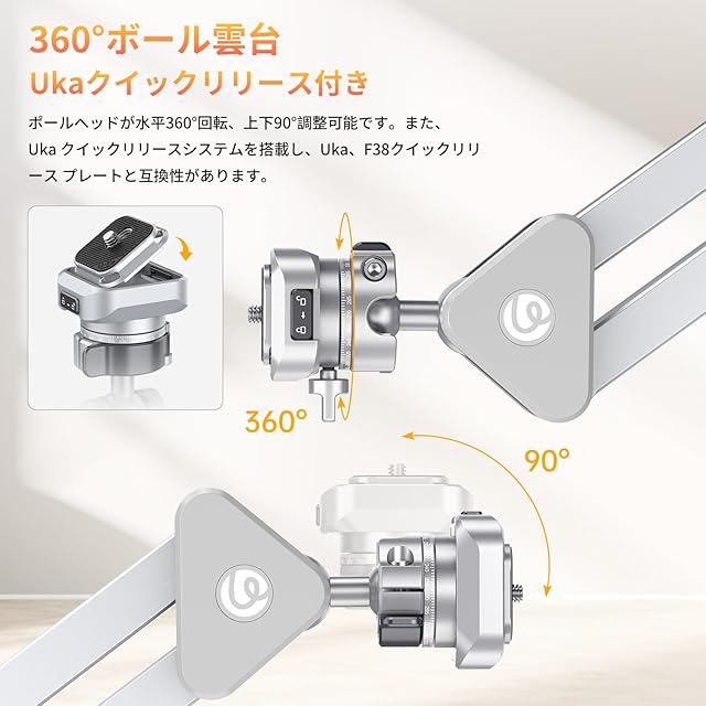 【360°ボール雲台・長いアーム】スプリング式デザインにより、ノブを調整し、ギアを好きな位置に配置する際に便利で効率的です。延長カメラアームが最大 910mm まで伸長できます。デバイスを高く配置するほど、撮影視角が広くなり、肉眼の視覚効果により近づきます。ポールヘッドが360°回転が可能、上下90°調整可能、横・縦構図を迅速に切り替え、多角度で自由に調整可能です。