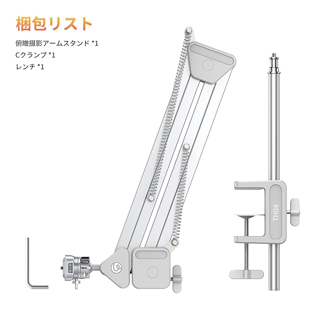 【幅広く対応・パーケージ】パーケージ:カメラアームスタンド×1、Cクランプ、レンチ×1、日本語取扱説明書×1。 多用途で、アンボクシング動画、フードブログ、作業スペースの写真撮影など様々なシーンに対応します。